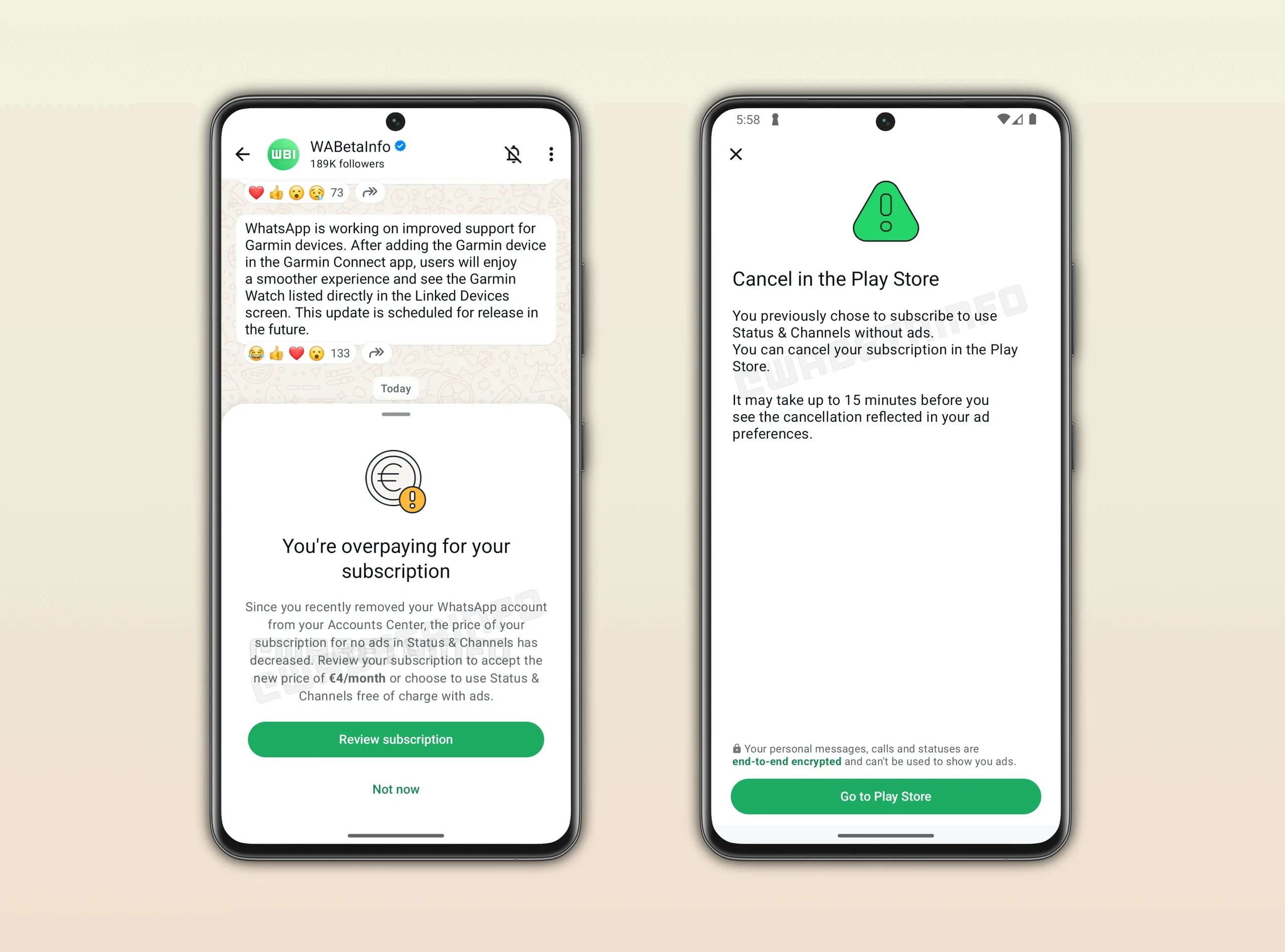 Les utilisateurs qui ne veulent pas voir de publicités pourraient payer un abonnement mensuel de 4 euros. Les fonctions principales de WhatsApp, telles que l'envoi de messages et les appels, devraient rester gratuites pour tout le monde. Pour l'instant, cela signifie que des publicités continueront d'être affichées dans les mises à jour de statut, et que des suggestions de chaînes intéressantes apparaîtront de temps à autre. De nombreux utilisateurs trouveront probablement cela plutôt dérangeant.