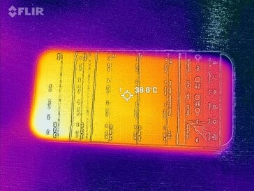 (-) La température maximale du côté supérieur est de 48.7 °C / 120 F, par rapport à la moyenne de 35.2 °C / 95 F, allant de 21.9 à 247 °C pour la classe Smartphone.