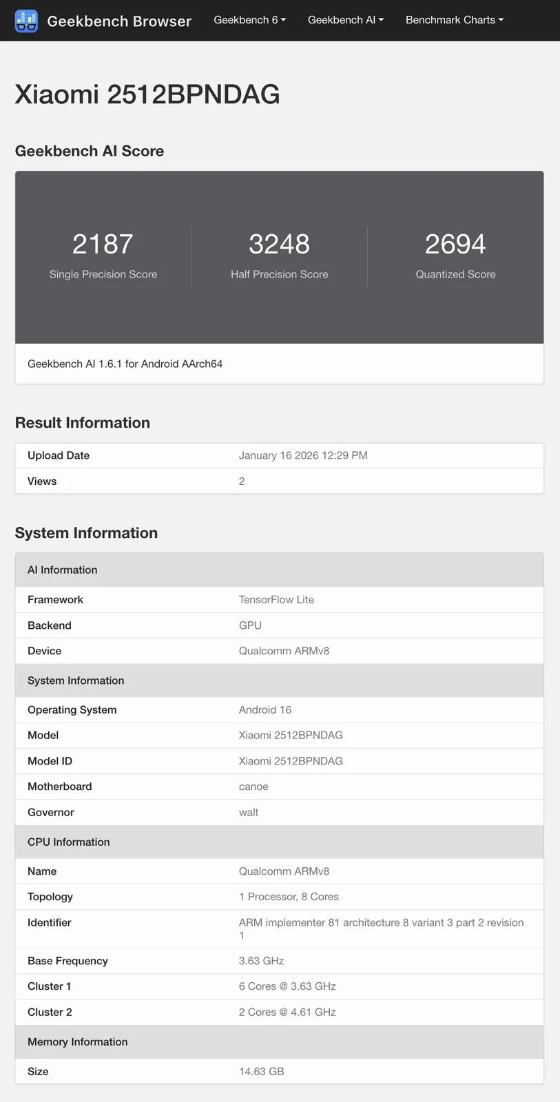 Cependant, la version mondiale du Xiaomi 17 Ultra vient de faire surface sur Geekbench. Identifiée par son numéro de modèle 2512BPNDAG, la variante mondiale devrait être rejointe par le Xiaomi 17 en dehors de la Chine. Sans surprise, le Xiaomi 17 Ultra conserve un design de type Qualcomm Snapdragon 8 Elite Gen 5 dans sa version mondiale. De plus, l'appareil sera disponible en dehors de la Chine sous Android 16 dès le départ, contrairement au récent Xiaomi 15T Pro Xiaomi 15T Pro (actuellement 844,50 $ sur Amazon).