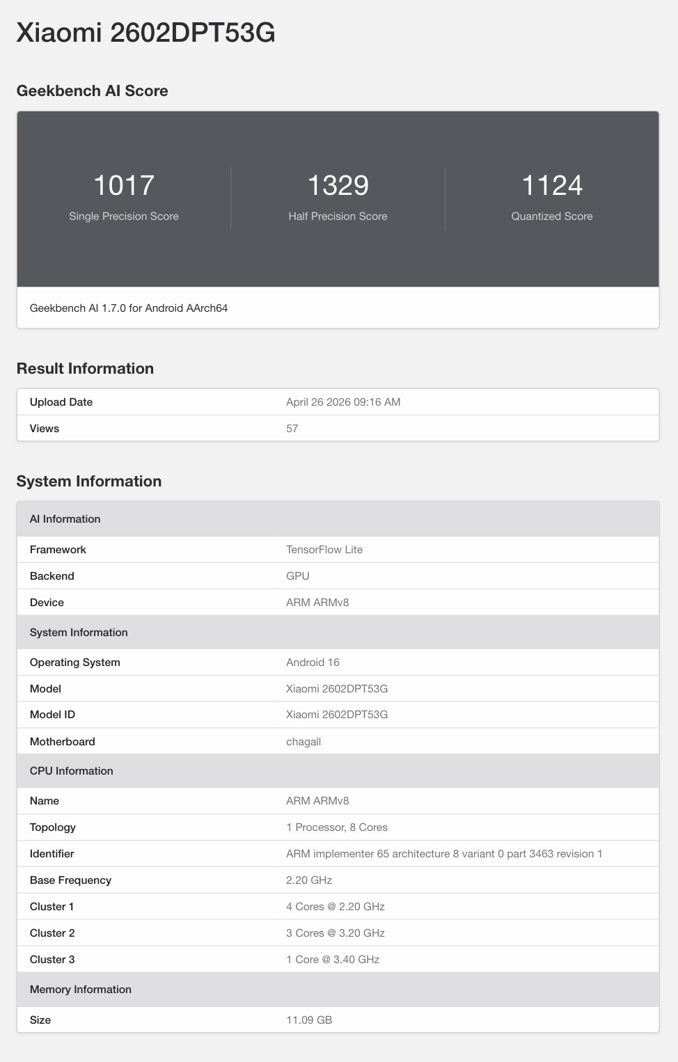 Un smartphone a fait surface sur Geekbench avec le numéro de modèle "2602DPT53G" Pour référence, le même numéro de modèle a précédemment plusieurs certifications réglementaires et devrait appartenir au Xiaomi 17T standard.