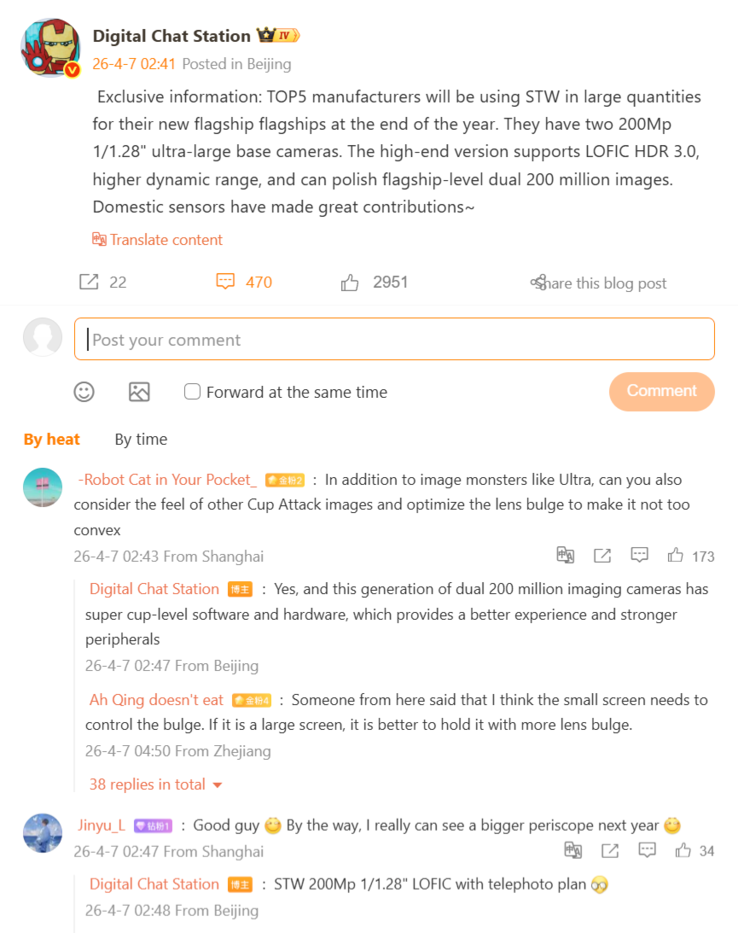 Plusieurs d'entre eux, dont apparemment Xiaomi, devraient s'appuyer davantage, vers la fin de l'année, sur des systèmes à double caméra de 200 MP basés sur des capteurs de 1/1,28 pouce du fabricant chinois de composants SmartSens, dont la version haut de gamme prendra en charge la troisième génération de LOFIC HDR pour une gamme dynamique exceptionnelle. Xiaomi utilise déjà LOFIC pour le capteur de 1 pouce du Xiaomi 17 Ultra, et d'ici fin 2026, la technologie pourrait également être utilisée pour la caméra téléobjectif dans une nouvelle version, comme cela a été précisé dans les commentaires sur Weibo.