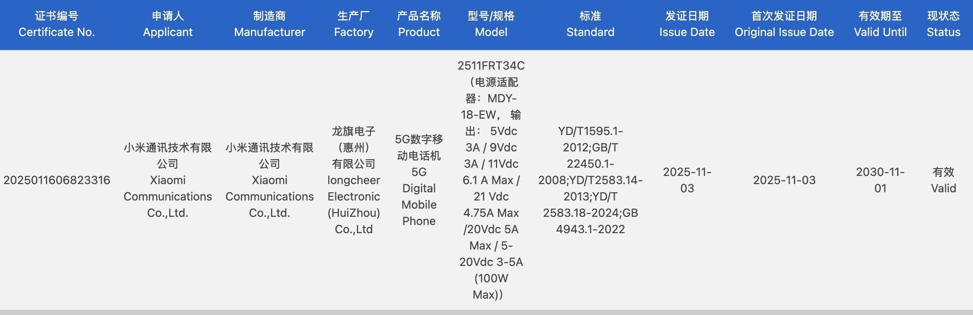 Un smartphone portant le numéro de modèle "2511FRT34C" a reçu la certification 3C en Chine. Selon un rapport précédentla certification 3C suggère que le prochain smartphone sera doté d'un support de charge rapide de 100W. Cependant, les autres spécifications restent encore mystérieuses.