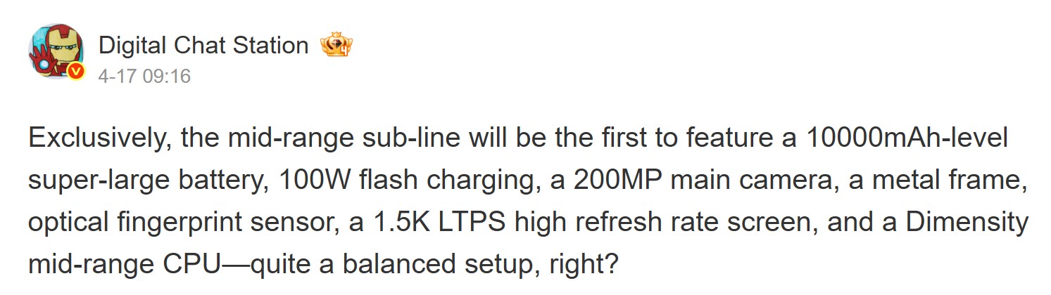 Un autre rapport, émanant de Digital Chat Station, laisse entendre que la gamme comprendra un téléphone doté d'une batterie de 10 000 mAh. Il s'agirait d'un véritable bond en avant par rapport à la batterie maximale de la série actuelle, et le leaker a une fois de plus rapporté quelque chose de similaire.