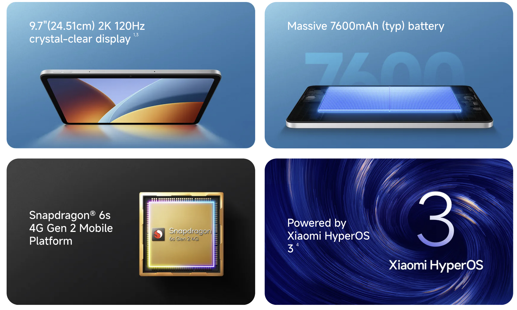 Pour autant que nous puissions en juger, le Redmi Pad 2 9.7 reprend tout le matériel de l'actuel Redmi Pad 2 SE. Par exemple, Xiaomi mentionne un chipset Snapdragon 6s 4G Gen 2, ainsi qu'une batterie de 7 600 mAh qui prend en charge la charge filaire de 18 W. La nouvelle tablette est également équipée d'un écran IPS 120 Hz d'une résolution de 2 048 x 1 280 au format 16:10 et d'une luminosité maximale de 600 nits en mode extérieur.