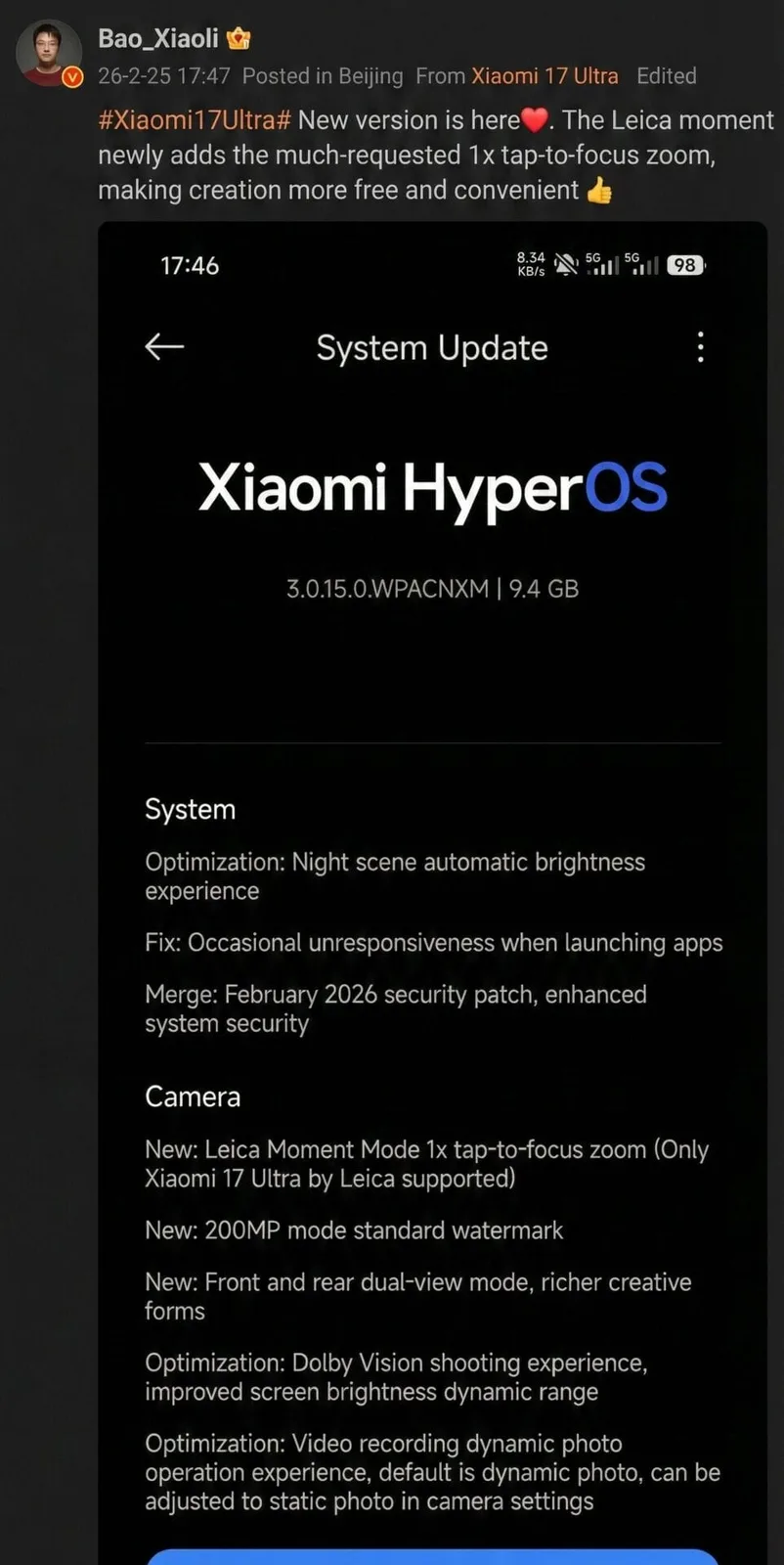 L'entreprise n'a pas encore oublié ses fans chinois. En effet, Xiaomi a décidé d'intégrer au Xiaomi 17 Ultra une fonctionnalité qui était auparavant exclusivement disponible sur la Leica Edition. Comme le montre la capture d'écran ci-dessous, la mise à jour de février 2026 du premier contient plus qu'un simple correctif de sécurité obligatoire. Au lieu de cela, elle regroupe plusieurs optimisations et nouvelles fonctionnalités, dont beaucoup se concentrent sur l'amélioration de l'expérience de l'appareil photo.