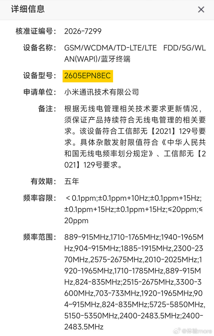 Plus précisément, plusieurs sources ont observé que la SRRC a certifié le mystérieux "2605EPN8EC" pour la vente en Chine. Rien qu'avec son numéro de modèle, nous pouvons en déduire que Xiaomi a l'intention de proposer l'appareil sur son marché national en mai 2026. Reste à savoir si cela se concrétisera.