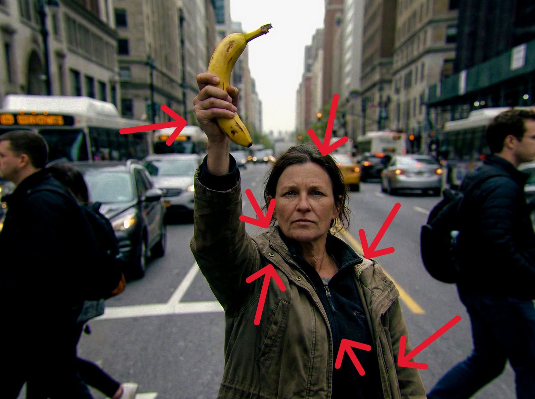 Dans la première partie de notre série, nous avons soumis l'image de la femme à la banane à différents outils de reconnaissance d'images par l'IA. Après quelques retouches d'images, six plateformes en ligne ont malheureusement abandonné l'image et déclaré qu'il ne s'agissait pas d'une image générée par l'IA. L'œil humain et un peu de bon sens sont bien plus utiles dans ce cas. L'image révèle toute une série de points qui indiquent l'existence d'une IA. Ceux qui restent sceptiques doivent être conscients des problèmes inhérents à la génération d'images. Les petits détails ne sont souvent pas rendus correctement. Il s'agit notamment des textures des tissus, des bijoux, des tricots, des fermetures à glissière et d'autres objets réguliers. Les bandes de roulement et les jantes des voitures et des avions, les surfaces en bois et les rides de la peau sont souvent le signe d'un traitement par l'IA.