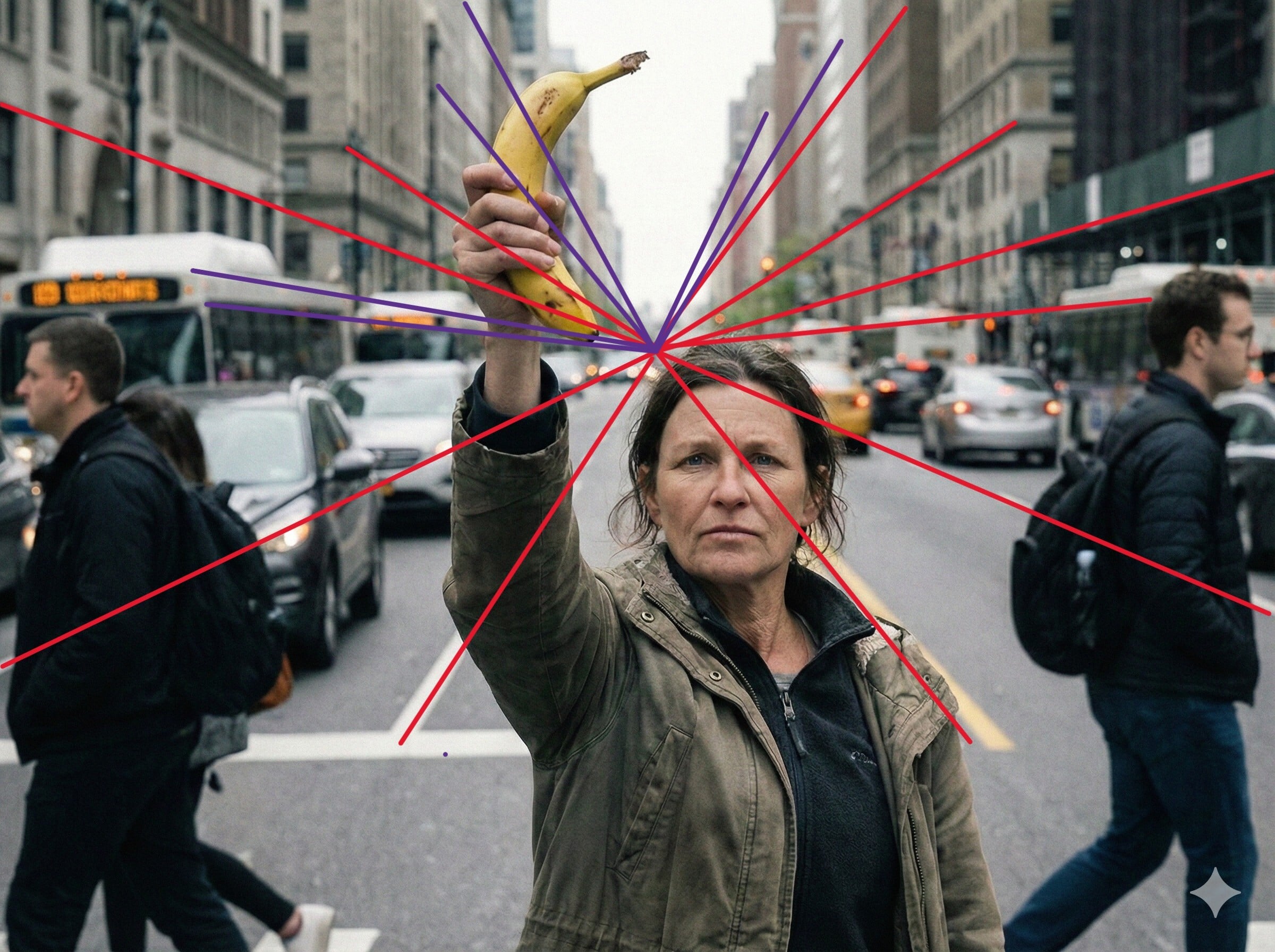 Le diable est aussi dans les détails. Gemini, ou plutôt Nano Banana Pro, rend bien la perspective. À première vue, un seul point de fuite est apparent. Cependant, un examen plus approfondi révèle que, malgré le flou, certaines lignes de point de fuite traversent des étages ou, dans le cas des deux bus de gauche, disparaissent tout simplement dans l'air. Après avoir déterminé le point de fuite de la perspective, nous avons coloré en violet les lignes que nous avons jugées incohérentes dans l'image