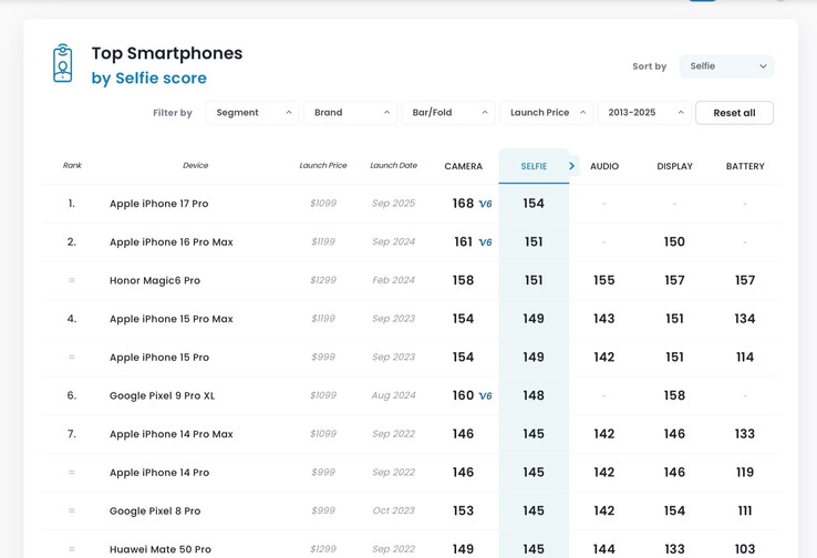 Selon une analyse détaillée de DxOMark, cette mise à niveau s'est avérée payante, puisque l'iPhone 17 Pro obtient 154 points dans l'évaluation de la caméra selfie et prend la première place du classement. Apple le nouveau fleuron de la marque devance l'iPhone 16 Pro et le Honor Magic6 Pro, qui ont tous deux obtenu 151 points et se retrouvent en deuxième position, suivis de l'iPhone 15 Pro avec 149 points et du Google Pixel 9 Pro XL avec 148 points.