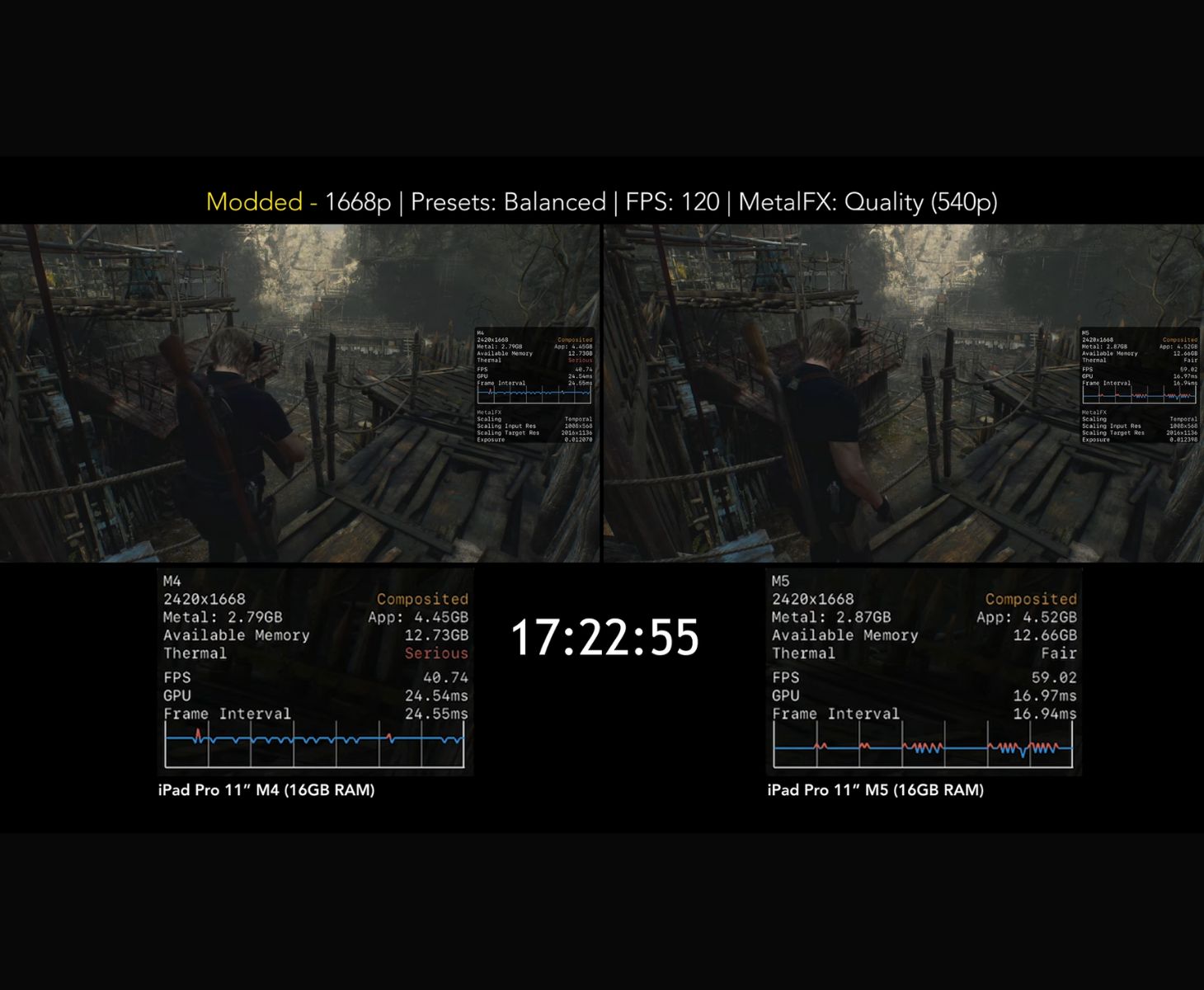 Le jeu tournait à environ 60 FPS lorsque le YouTuber a modifié les fichiers de configuration, en réglant le préréglage sur Équilibré, en réduisant la résolution, en activant le mode Qualité MetalFX et en réglant l'objectif FPS sur 120. Avec ces réglages plus élevés, l'iPad Pro M5 atteignait entre 50 et 60 FPS. L'iPad Pro M4 a quant à lui chuté au milieu de la quarantaine, et l'iPad Pro M1 a eu du mal à maintenir ne serait-ce que 20 FPS.