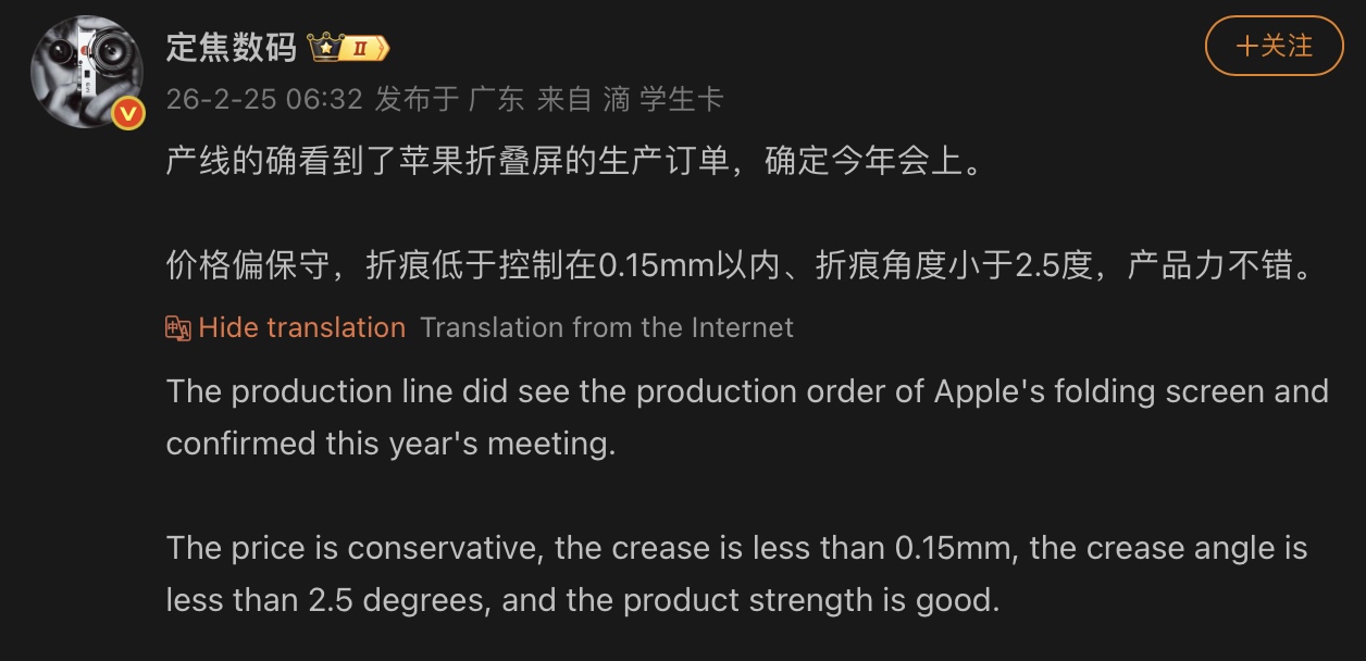 Une fuite récente partagée par Fixed Focus Digital via Weibo, a mis en lumière quelques détails intéressants concernant l'écran sans plis de l'iPhone Fold susmentionné. Selon lui, le lancement du produit est en effet confirmé pour cette année, les commandes de production ayant déjà été passées.